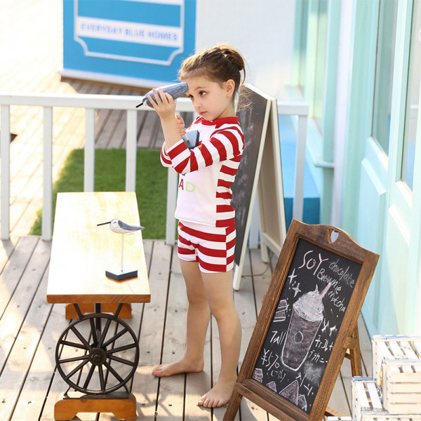 經典紅白條紋款抗菌衣防曬速乾長袖女童游泳衣【春夏戲水,秋冬泡湯四季可穿兒童泳裝系列】長袖防曬分體泳衣潛水衝浪服/特殊防曬及速乾特性3件式泳衣+泳褲+泳帽套裝組/泡湯裝/戲水沙灘裝☆
