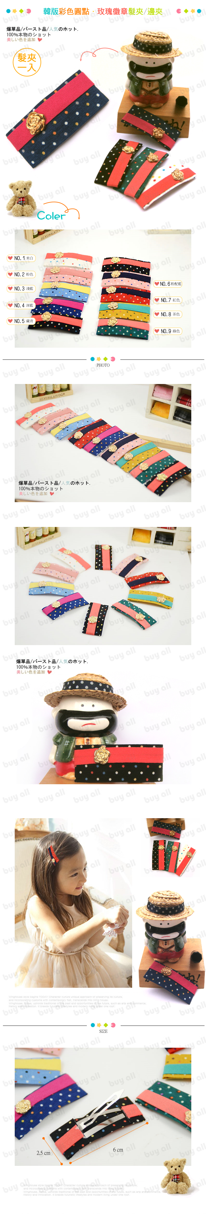 【兒童髮飾宴會造型系列】韓版彩色圓點.玫瑰徽章髮夾/邊夾/開口夾Y夾/兒童髮飾/ 宴會髮飾/兒童髮夾/瀏海夾《1入裝》☆9色☆