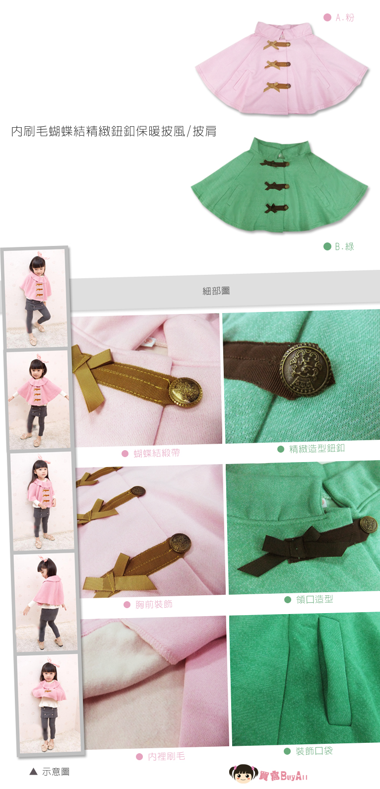 【秋冬禦寒保暖披肩,披風,外套系列】內刷毛蝴蝶結精緻鈕釦保暖披風/披肩 粉/綠兩色 110/130cm
